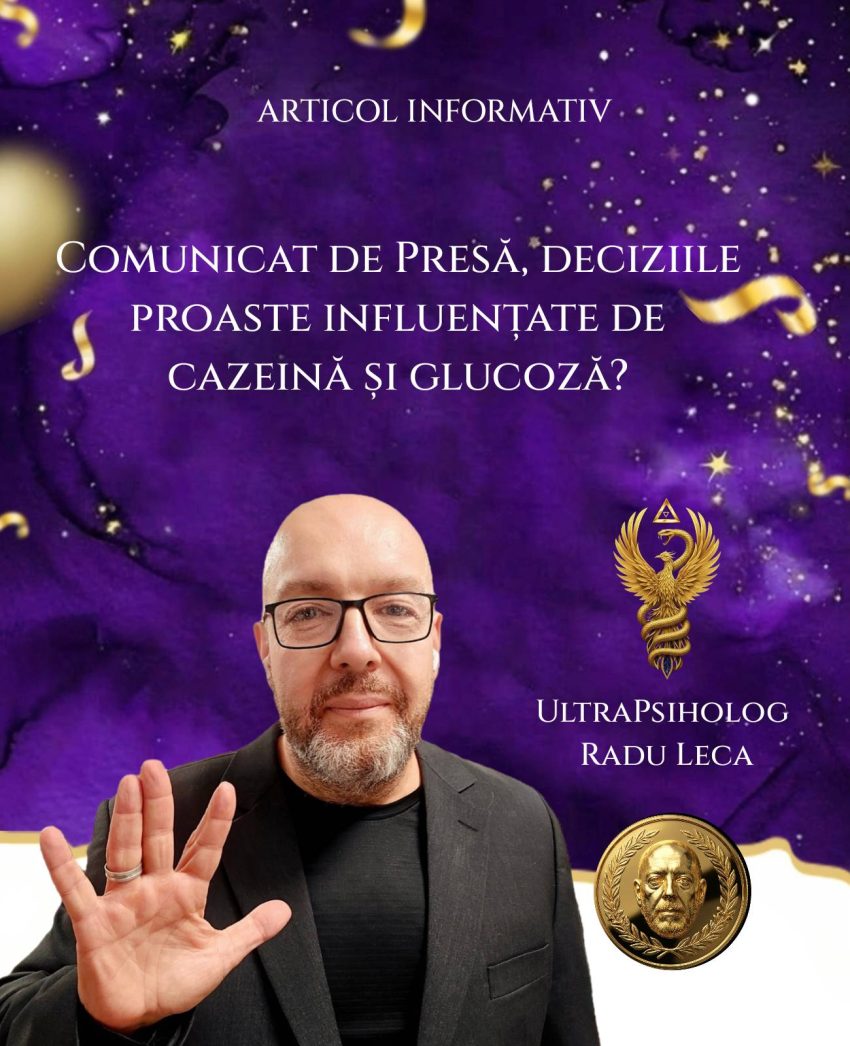 COMUNICAT DE PRESĂ Psihologul Radu Leca prezintă o lucrare despre influența cazeinei și a glucozei asupra luării deciziilor București, 13.04.2026, Psihologul Radu Leca, cu expertiză în psihologie clinică și psihoterapie, dar și cu expertiză în psiho-nutritie, lansează o lucrare de analiză și popularizare care propune o perspectivă clară și aplicată asupra legăturii dintre alimentație și…